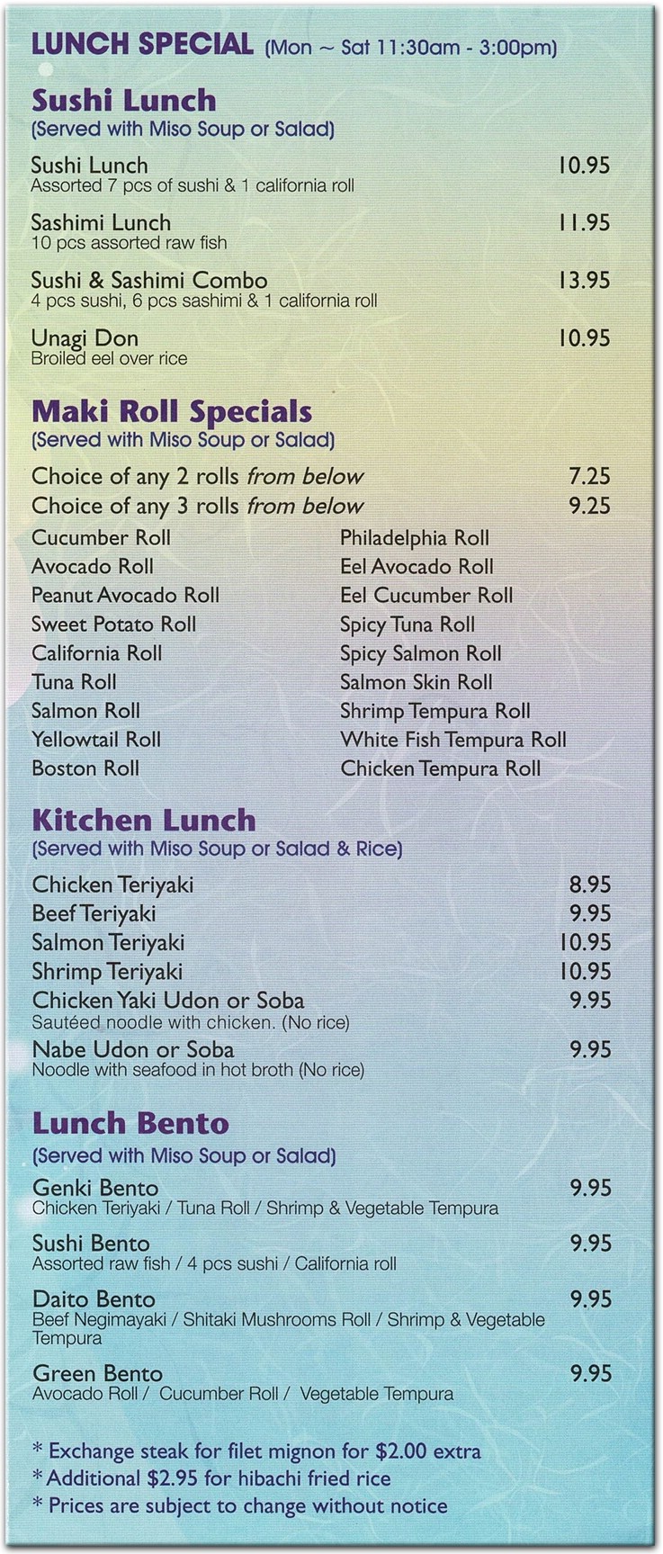 Genki Sushi Bento Menu Hawaii : Genki sushi 3 pcs of tuna, 3 pcs of eel, 3 pcs of yellowtail & 1 spider roll. Genki Sushi Bento Menu Hawaii : Home of the bullet express.