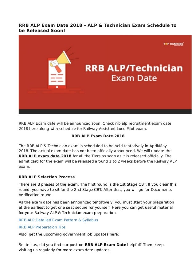 Rrb Alp Exam Date 2018 / Get all updates about alp & rpf and group d recruitment 2018 including the age limit extension, eligibility criteria, exam fee exemption.